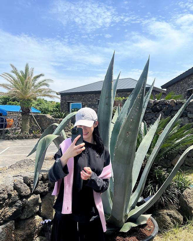 여행지에서 공승연은 블랙 후드티에 핑크 컬러 니트 가디건을 매치해 포인트를 준 레이어드 룩을 연출하고 있다. 화이트 캡과 함께 스포티하면서도 여성스러운 매력을 동시에 표현했으며, 선인장과 야자수가 있는 이국적인 배경 속에서 자연스러운 셀카 포즈로 여행의 즐거움을 담아내고 있다.