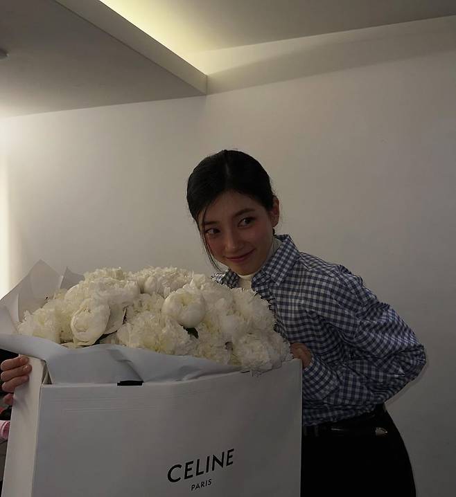 또 다른 사진에서는 체크 셔츠와 블랙 팬츠로 내추럴한 캐주얼룩을 선보이며, 커다란 화이트 플라워 박스 옆에서 사랑스러운 미소를 지었다.