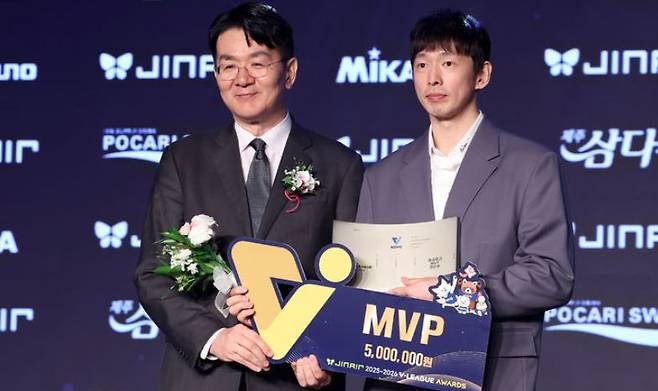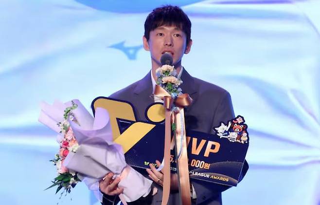 2026년 4월 13일, 서울 그랜드 워커힐 호텔에서 열린 V-리그 시상식의 주인공은 단연 한선수였습니다. 대한항공의 주전 세터로서 팀의 통합 우승을 이끈 그는 기자단 투표 34표 중 15표를 획득하며 통산 두 번째 정규리그 MVP를 차지했습니다. 이는 3년 전 자신이 세웠던 역대 최고령 MVP 기록(38세)을 스스로 경신한 대기록으로, 41세라는 나이가 무색할 만큼 코트 위에서의 지배력이 여전히 압도적임을 증명했습니다. 시상대 위에 선 그는 자신을 "아직 현역으로 뛰고 있는 노장"이라고 소개하며 겸손함을 보였지만, 그가 뿜어내는 아우라는 이미 리그 전체를 압도하고 있었습니다.