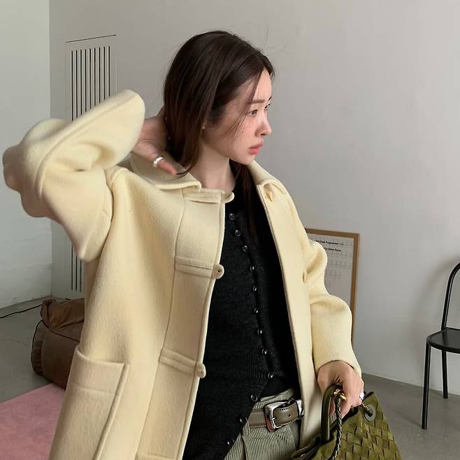 두툼한 소재의 버터 컬러 더플코트,