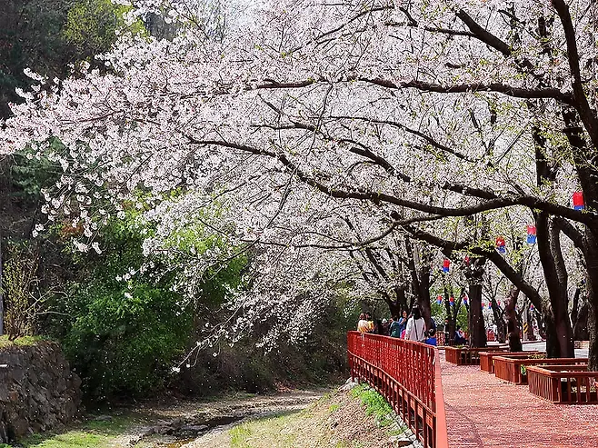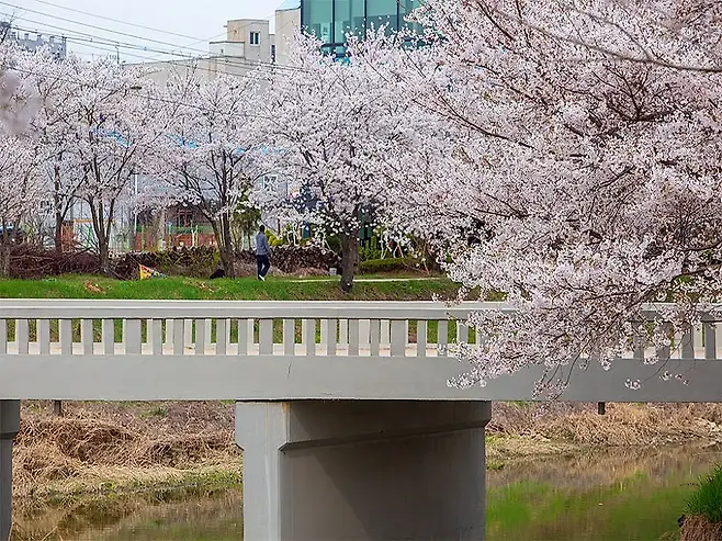수원 권선구 오목천동을 흐르는 황구지천 인근에는 ‘십 리’에 걸쳐 벚나무가 심어져 있어, 하천 양쪽을 따라 피어나는 벚꽃을 한눈에 바라볼 수 있습니다. 산책로가 깔끔하게 조성되어 있어 아이부터 어르신까지 누구나 편안하게 봄나들이를 즐길 수 있지요.