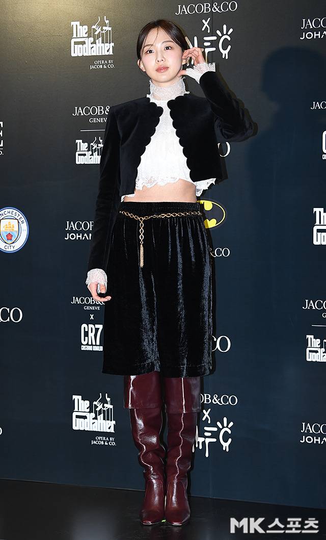 짧은 크롭 벨벳 재킷과 레이스 디테일의 블라우스로 고급스러운 분위기를 연출하면서도, 하이웨이스트 벨벳 스커트로 우아한 실루엣을 완성했습니다.