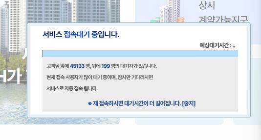 이날 오전 10시 LH청약플러스에서 해당 단지 전용면적 55㎡ 1가구에 대한 무순위 청약이 시작되자 접속자 수는 순식간에 6만 명을 넘어섰다. 청약 접속 페이지는 사실상 마비됐다. 실제로 오후 5시 30분 기준 접속 대기자는 5만6000여 명, 앞선 대기 인원이 빠져도 순식간에 4만 명 이상이 다시 줄을 이었다.