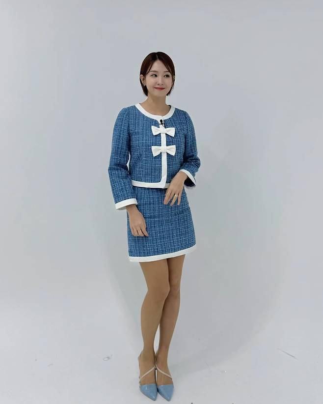 블루 컬러의 트위드 재킷과 미니스커트로 구성된 샤넬풍 세트룩을 완성하고 있다. 화이트 트리밍이 들어간 재킷에 리본 디테일이 더해져 페미닌한 매력을 강조하고 있다. 블루 포인티드 힐과 매치하여 클래식하면서도 모던한 감각을 드러내고 있다.