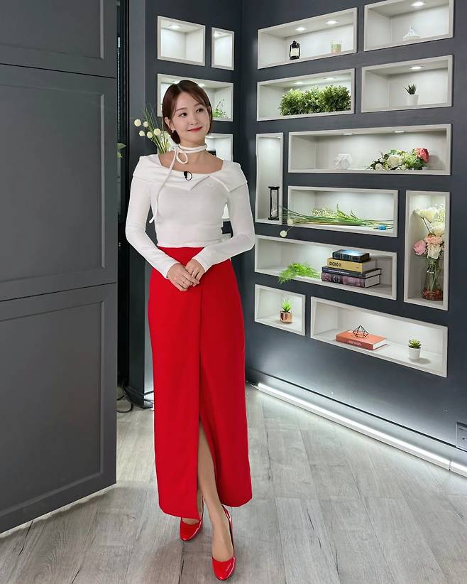 오정연이 화이트 블라우스와 레드 롱스커트를 매치한 세련된 정장 스타일을 연출하고 있다. 오프숄더 디자인의 화이트 상의가 우아함을 더하며, 사이드 슬릿이 들어간 레드 스커트가 세련된 실루엣을 완성하고 있다. 같은 톤의 레드 힐로 포인트를 주어 통일감 있는 모노톤 룩을 선보이고 있다.