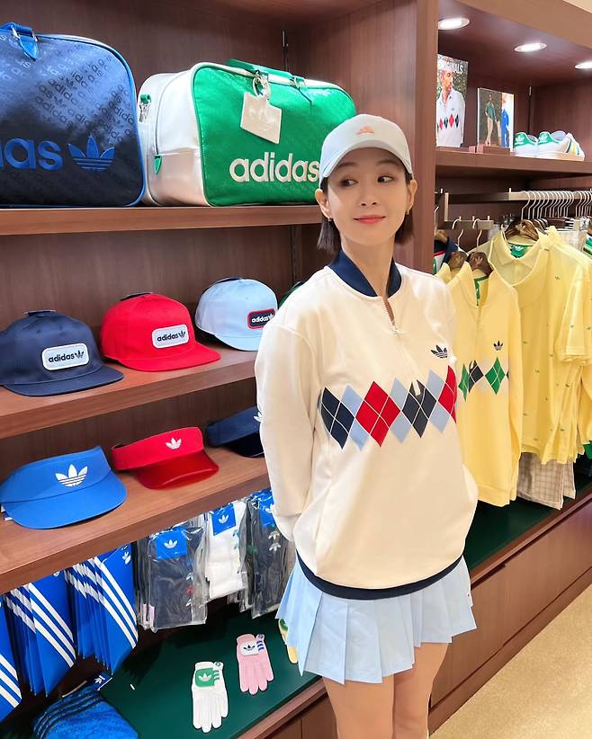 아디다스 매장에서 화이트 베이스의 스포츠웨어를 착용한 모습이다. 컬러풀한 다이아몬드 패턴이 들어간 상의와 화이트 플리츠 스커트를 매치하여 스포티하면서도 페미닌한 스타일을 연출하고 있다. 화이트 캡으로 전체적인 룩의 완성도를 높이고 있다.