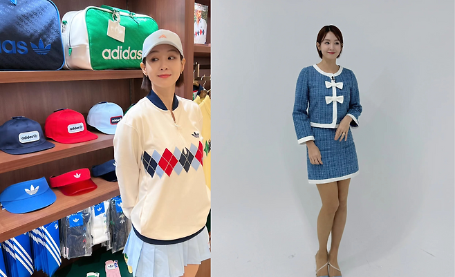 블루 컬러의 트위드 재킷과 미니스커트로 구성된 샤넬풍 세트룩을 완성하고 있다. 화이트 트리밍이 들어간 재킷에 리본 디테일이 더해져 페미닌한 매력을 강조하고 있다. 블루 포인티드 힐과 매치하여 클래식하면서도 모던한 감각을 드러내고 있다.