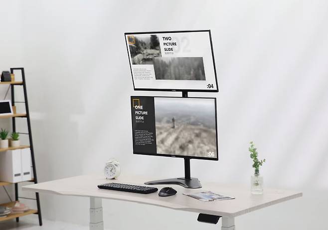 일반적인 듀얼 모니터 설정은 좌우로 배치하는 것이 대부분이나 상하로 배치할 경우 일반 모니터 암의 각도는 한계가 있어 올리기가 어렵다. 이럴 땐 폴타입 모니터 스탠드를 사용하는 것이 효과적이다.