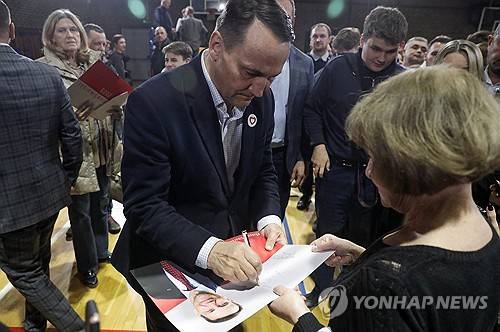 epa11726402 Polish Foreign Minister Radoslaw Sikorski (C) of the rulling party Civic Platform signs autographs during his meeting with local residents in Pruszkow, central Poland, 17 November 2024. The centrist Civic Coalition (KO) will hold the primary elections to select a joint candidate for Poland's presidential race on 23 November 2025. The primaries will be limited to two candidates, the Mayor of Warsaw Rafal Trzaskowski and Sikorski. EPA/TOMASZ GZELL POLAND OUT