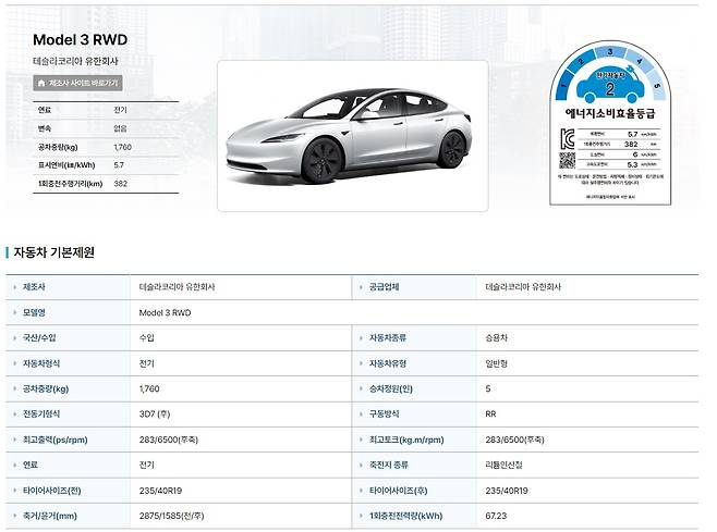 모델3 하이랜드는 국내에서 후륜구동인 RWD 트림과 사륜구동인 롱레인지 트림, 총 2가지로 선보인다. RWD 트림은 닝더스다이(CATL)의 67킬로와트시(㎾h) 용량의 리튬인산철(LFP) 배터리를 장착했다. 1회 충전 최대 382㎞ 주행할 수 있고, 전비는 5.7㎞/㎾h다. 최고출력은 283마력이고, 정지 상태에서 시속 100㎞까지 6.1초만에 도달한다.
