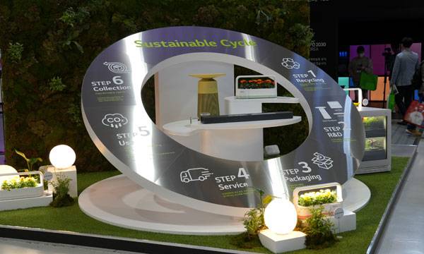 이와 함께 LG전자의 ESG 비전을 소개하는 '지속 가능한 사이클(Sustainable Cycle)' 조형물과 식물생활가전 LG 틔운 미니, LG 사운드 바, 퓨리케어 에어로퍼니처 등 재활용 플라스틱을 사용한 친환경 제품들도 전시했다.