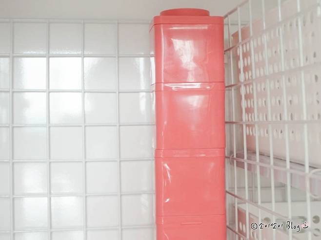 적층이 가능한 펜트리 메쉬바구니에요. 다이소몰에서 검색해 보니 색상은 2종이네요. 지금 보시는 베이지와 핑크가 있대요~ 하지만 정리는 뭐다? 화이트다!