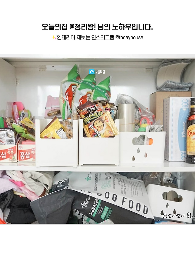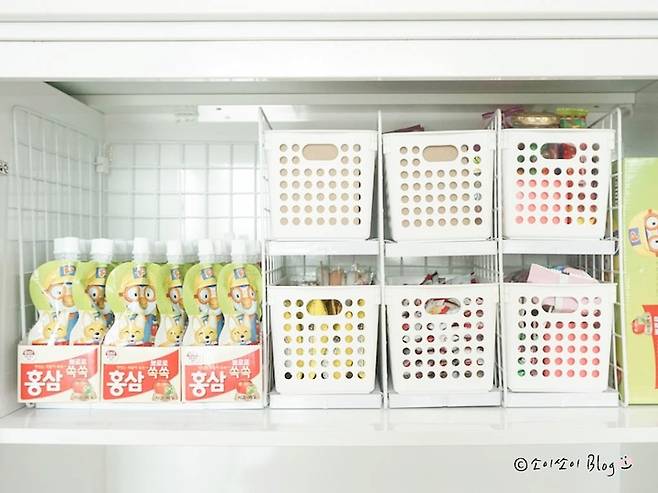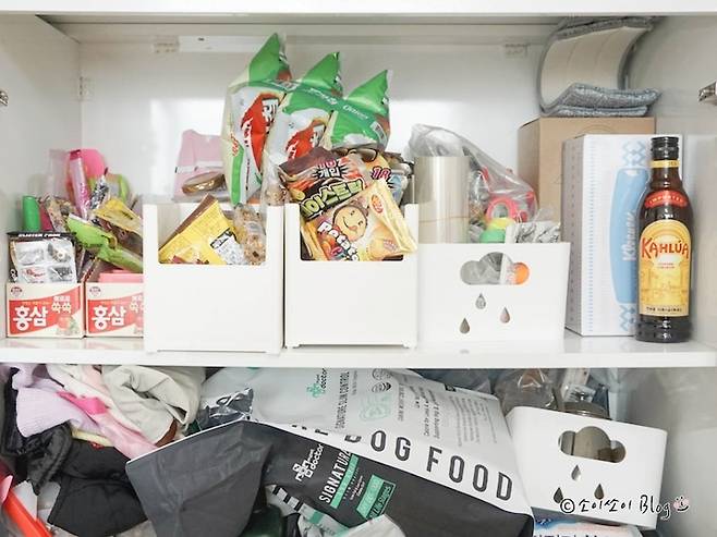 바닥에 널브러진 간식들을 다시 바구니에 차곡차곡 정리를 끝냈어요. 아까보다 훨씬 더 보기에도 꺼내기에도 편하게 이용할 수 있을 것 같지 않나요? :)