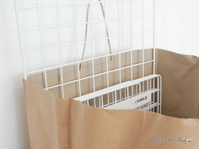 타공보드 위에 슬라이드 하듯 쓸 거라 비슷한 사이즈의 바구니가 필요했어요. 모양이 마음에 들면 너무 작거나 커서 바구니 코너 다 돌아다니며 대 본 결과 메쉬바구니 2호가 가장 잘 맞더라고요!