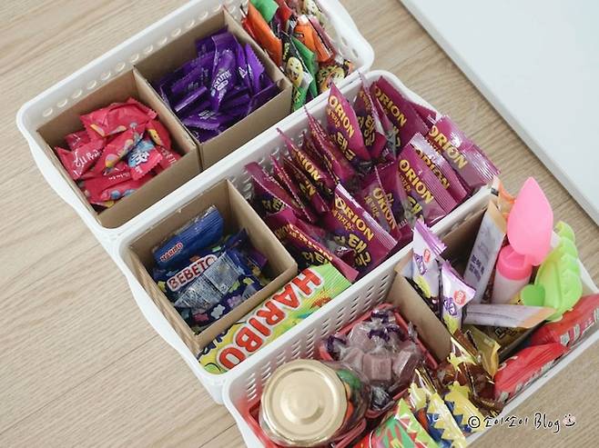과자는 과자대로 사탕은 사탕대로 종류별로 구분해 담아봤어요.