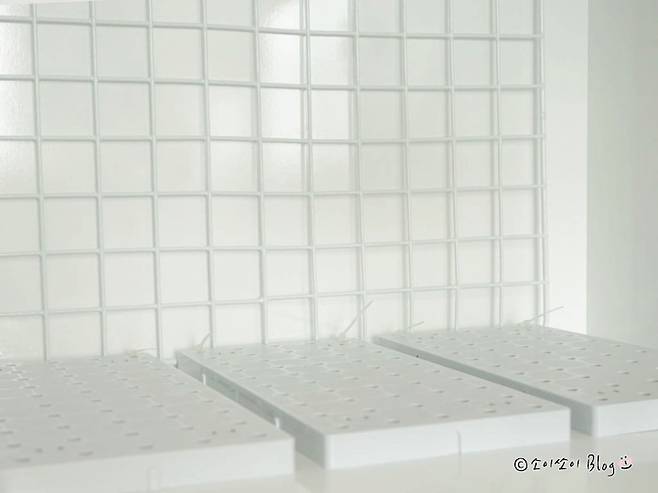 타공보드 고정이 끝났으면 사이사이에 네트망을 연결해요. 이때 주의해야 할 부분은 역시 간격이에요!