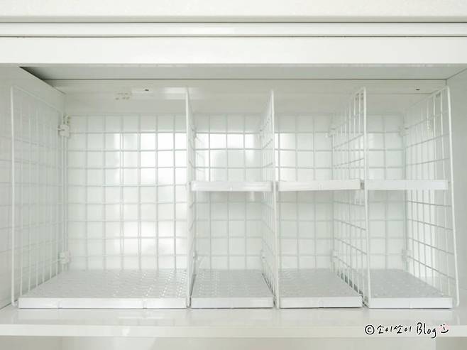 똑같은 작업을 반복하면 드디어 완성! 주방 서랍장 가로 사이즈가 75cm, 다이소 네트망 사이즈가 69cm라서 옆이 살짝 남는 게 아쉽긴 하네요...