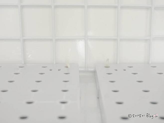 타공보드가 완벽하게 고정되진 않았지만 간식 정도의 무게는 거뜬히 버틸 수 있어 밑으로 내려앉거나 하지 않아 다행이에요. :)