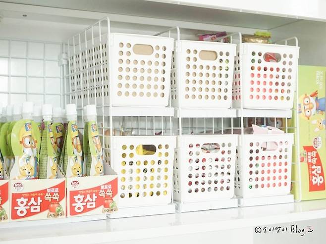 바닥에 널브러진 간식들을 다시 바구니에 차곡차곡 정리를 끝냈어요. 아까보다 훨씬 더 보기에도 꺼내기에도 편하게 이용할 수 있을 것 같지 않나요? :)