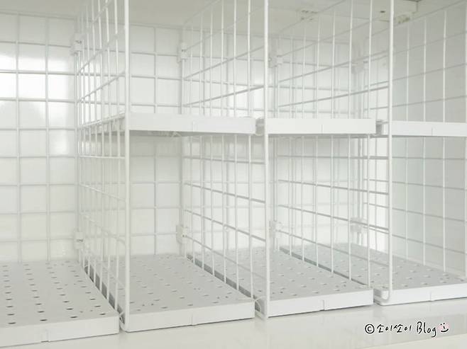 네트망 뒤쪽을 세어보면 12칸이 남아요. 우리가 사용할 건 타공판 3개잖아요~? 1개당 4칸으로 나누어 위치를 잡아줍니다. 사진처럼 공간이 남아야 정상이에요!