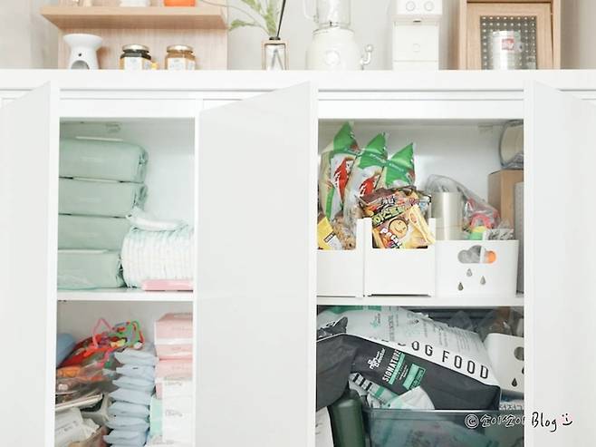 아래쪽은 강아지 용품을 넣어놨답니다. 여기도 조만간 정리해야지 싶었었는데 이 정도면 깔끔하네요?