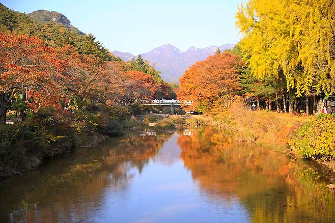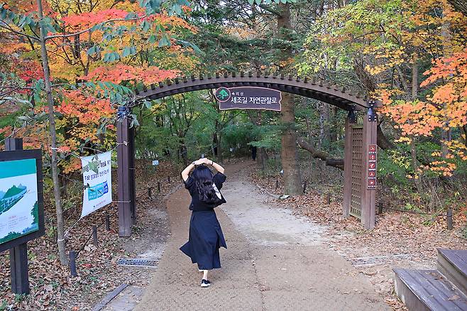 속리산의 대표적인 산책 코스인 세조길 은 법주사 일주문에서 세심정까지 약 2.4km 이어지는 숲길입니다. 조선 세조가 병을 치료하기 위해 자주 걸었다는 전설이 전해지는 이 길은 경사가 완만해 남녀노소 누구나 걷기 좋은 탐방로로 사랑받고 있습니다. 걷다 보면 만나는 태평쉼터, 세조목욕소, 석련지, 세심정은 잠시 발걸음을 멈추고 풍경을 감상하기에 좋은 포인트입니다. 가을이면 길 양옆으로 붉게 물든 단풍이 하늘을 덮으며 마치 붉은 터널을 걷는 듯한 감동을 전해줍니다. 조용히 걷기만 해도 마음이 편안해지는 속리산의 가을,
