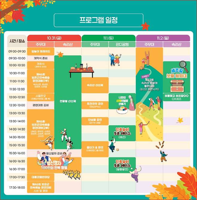 단풍이 붉게 물든 세조길을 걷고, 법주사 경내에서 천년의 시간을 느끼며, 잔디공원에서 흥겨운 공연과 전통놀이 를 즐기는 시간.