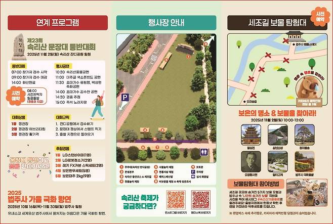 속리산 잔디공원과 법주사 일원에서 펼쳐지는 2025 속리산 가을풍류축제는 하루 종일 볼거리, 먹거리, 체험거리로 가득합니다.
