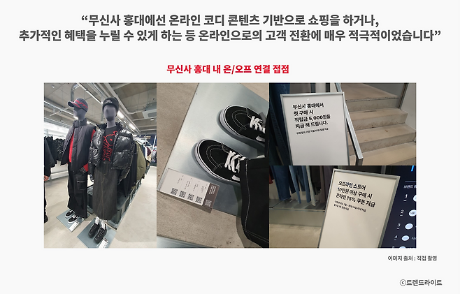 그래서인지 직접 방문해 본 무신사 홍대가 가장 신경 쓴 부분은 역시나 옴니채널 구축이었습니다. 옴니 채널이란, 고객이 온/오프라인 채널 어디에서든 같은 매장을 이용하는 것처럼 느낄 수 있도록 한 쇼핑 환경을 뜻하는데요. 완성도 높은 옴니 채널은 고객의 경험을 강화하는 것은 물론, 온/오프라인 간 고객의 이동을 촉진시키기도 합니다.