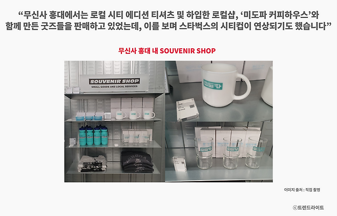 개인적으로 무신사 홍대에서 가장 감탄했던 포인트 역시, 이러한 노력이 잘 담겨 있던 '로컬 수베니어 샵(Local Souvenir Shop)'이었는데요. 무신사는 각각의 공간들을 단순한 매장을 넘어 지역 문화를 이끄는 명소로 만들고자, 로컬 기반의 브랜드와 협업한 시티 에디션 상품을 선보이고 이를 별도로 진열하여 판매하고 있었습니다. 고요웨어, 오호스 등 6개 브랜드는 로컬 시티 에디션 티셔츠를 만들었고, 하입한 로컬샵과 협업하여 별도의 굿즈도 제작하였습니다. 무신사 홍대 오픈을 기념해선 '미도파 커피하우스'와 함께 만든 굿즈들을 판매 중에 있었고요.