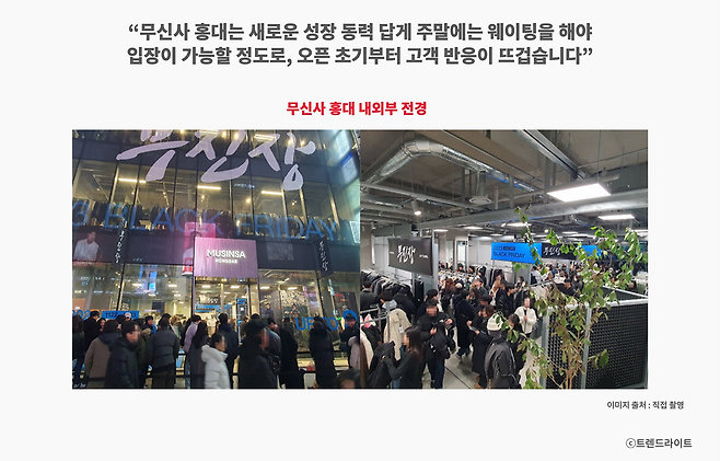 이러한 무신사 플래그십 스토어는 현재 대구, 홍대에 이어 성수까지 오픈이 예정되어 있다고 합니다. 이들 매장들이 가진 특성에 따라 기대하는 역할도 다소 차이가 있는데요. 무신사 대구에게 수도권 대비 상대적으로 낮은 지방의 무신사 침투율을 높이는 역할을 기대한다면, 홍대와 성수는 내국인은 물론 외국인 관광객들의 수요까지 겨냥하고 있습니다.