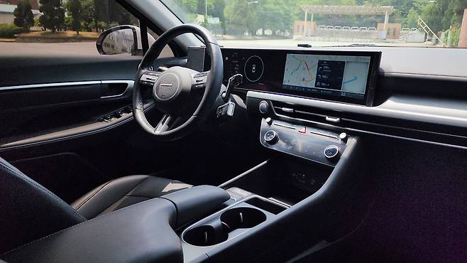 실내 디자인도 페이스리프트치고 많은 변화가 있다. 인포테인먼트는 12.3인치 파노라믹 커브드 디스플레이로 구성했고, 최신 UI를 적용한다. 기존 쏘나타의 불편함으로 지적받았던 버튼식 기어 대신 칼럼 기어를 사용하기도 한다. 스티어링 휠에 엠블럼이 없다는 점도 특징이 될 수있다. 주행보조 기능은 전부 스티어링 휠 스포크에 배치되고, 일부 버튼은 암레스트 끝부분에 배치되었다. 에어벤트나 수납공간, 오토 에어컨 등 실내 구성요소의 디자인이 깔끔하게 마감되어 있다. 앰비언트 무드램프의 적용 범위가 디스플레이 하단에만 제한적인 건 아쉽다.