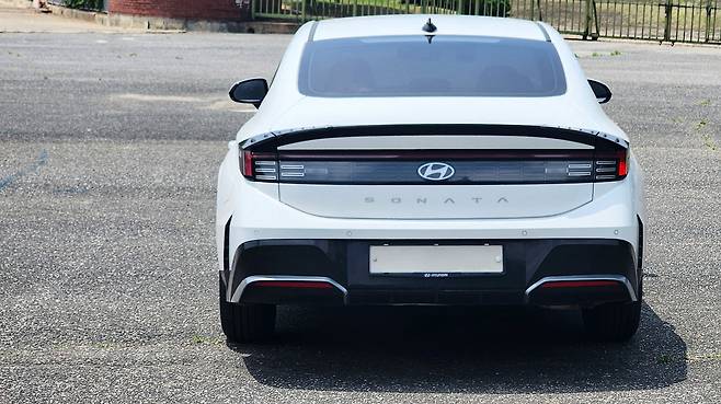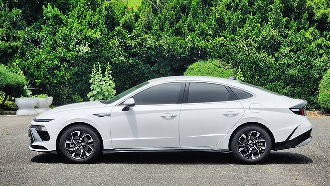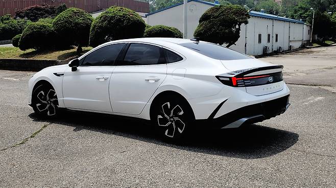측면 디자인은 매끄럽고 날렵하게 다듬어져 있다. 원래 쏘나타의 디자인 철학은 '센슈어스 스포티니스'였다. 스포츠카처럼 곡선형으로 뻗어나가는 C 필러와 측면 패널을 과감하게 장식하는 라인들이 감각적인 조형미를 보인다. 이번 페이스리프트와 함께 전면 포지션이 더욱 낮아 보이고, 리어 오버행이 길게 상승하는 형태라서 공격적인 자세가 더욱 잘 느껴진다. 시승 차량은 엔트리 트림의 17인치 휠이 적용되어 있는데도 디자인이 꽤나 매력적이다. 로커패널을 블랙 하이그로시 색상으로 마감하면서 디자인의 포인트를 더했다.