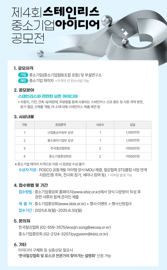 스테인리스스틸클럽과 중기중앙회는 오는 6월 9일부터 30일까지 제4회 중소기업 아이디어 공모전을 개최한다. 본 공모전은 스테인리스 관련 혁신 아이디어를 보유한 우수 중소기업의 발굴·지원을 통한 스테인리스 신수요 창출 및 대-중소기업 상생 협력을 강화하는 차원에서 지난 2022년부터 매년 개최되고 있다.