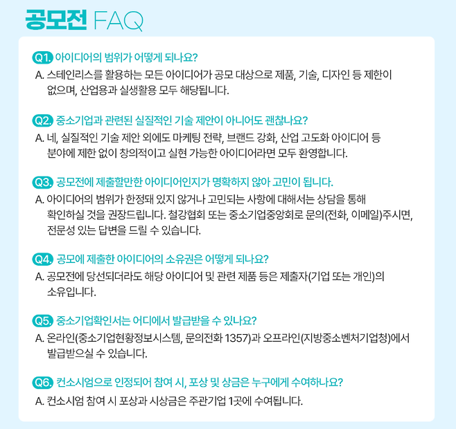 이번 4회차 공모전은 이전과 같이, 중기중앙회 홈페이지 내 전용 공간(https://www.kbiz.or.kr/ko/cscm/event2/view.do?mnSeq=1741&seq=6663&pg=1&pgSz=9)을 통해 상세 안내와 아이디어 공모 접수를 진행한다. 공모전에 제출할 아이디어의 범위 또는 참여에 있어 모호한 부문이 있다고 생각하는 경우 철강협회(02-559-3575/woojin.song@ekosa.or.kr) 또는 중소기업중앙회(02-2124-3207/pygyeom@kbiz.or.kr)에 문의하면 관련 전문가가 답변할 예정이다.