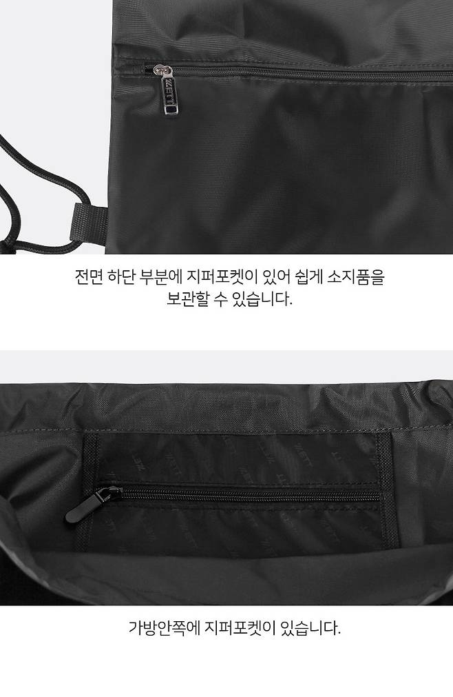 전면 하단, 내부에 지퍼포켓으로 다양한 소지품 수납이 가능합니다!