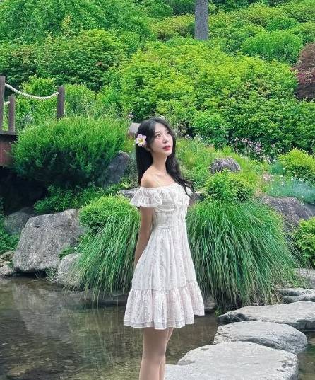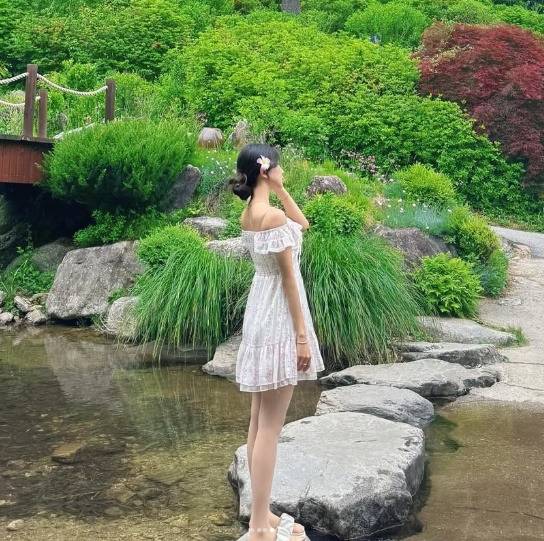 🌸 4. 오프숄더 레이스 원피스: 계곡 감성 여친룩의 정석