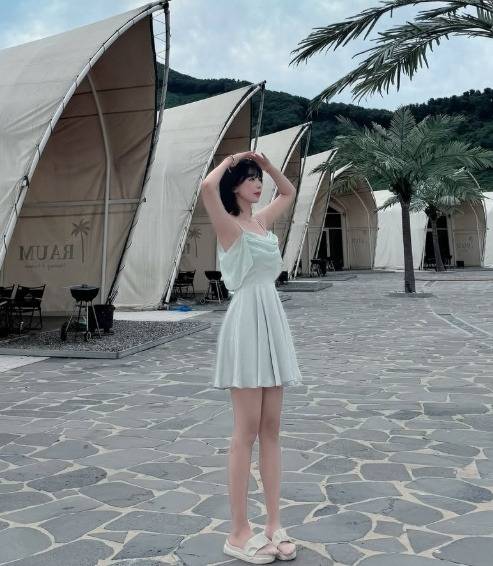 🤍 5. 민트 슬립 미니드레스: 호캉스 룩의 끝판왕