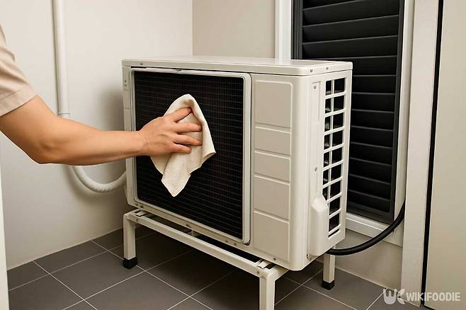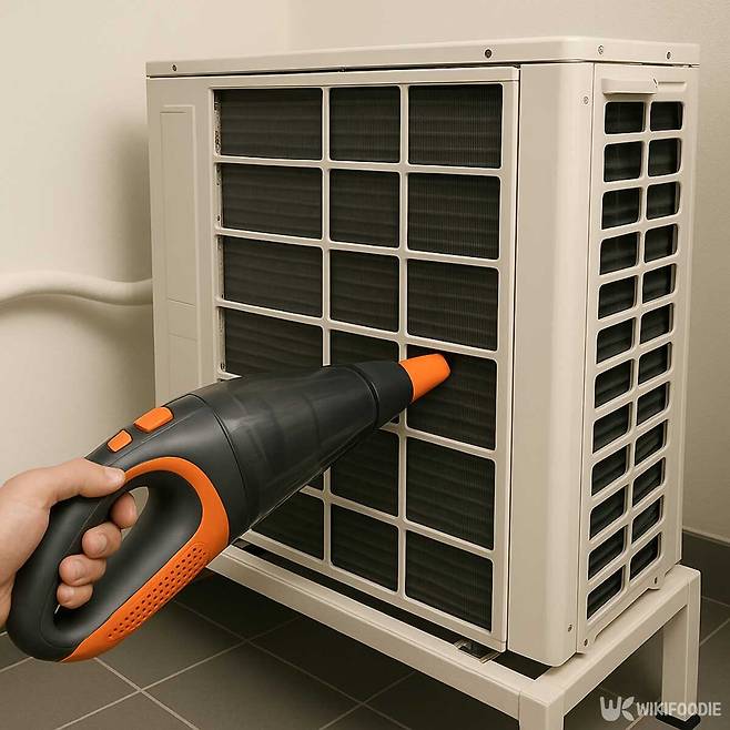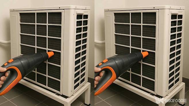 - 실외기 방열판 사이 먼지를 마른 솔이나 블로어로 털어낸다.
