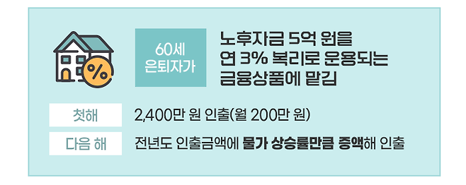 예를 하나 들어보겠습니다. 60세 은퇴자가 노후자금 5억 원을 연 3% 복리로 운용되는 금융상품에 맡겨 두었습니다. 그리고 첫해 2,400만 원(월 200만 원)을 생활비로 인출하고, 이듬해부터는 전년도 인출한 금액에 물가 상승률만큼 증액해서 인출하고자 합니다.