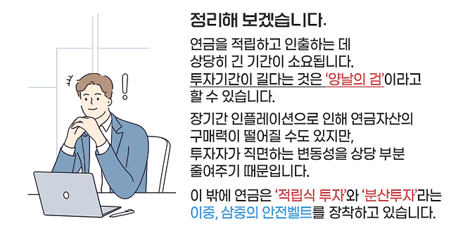 사람마다 다르지만 연금을 적립하고 인출하는 기간을 전부 더하면 운용 기간이 최소 20~30년은 됩니다.