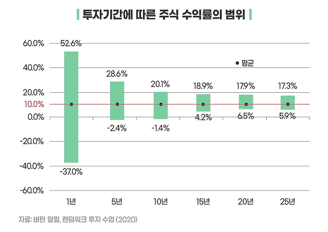 하지만 투자기간이 늘어날수록 수익률의 변동 폭은 줄어드는 것을 확인할 수 있습니다.