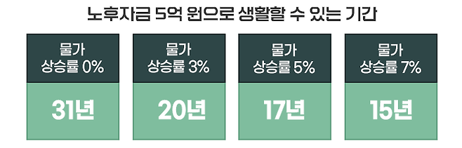 은퇴생활 기간 동안 물가가 전혀 오르지 않는다면, 은퇴자는 5억 원으로 31년을 생활할 수 있습니다. 하지만 매년 물가가 3%씩 오르면 20년을 버틸 수 있습니다.