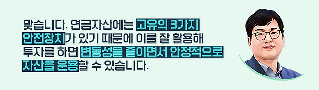 맞습니다. 사람들은 노후 생활비 재원이 될 연금은 안전해야 한다고 생각합니다. 하지만 무엇으로부터 안전해야 하는지 잘 생각해 봐야 합니다.