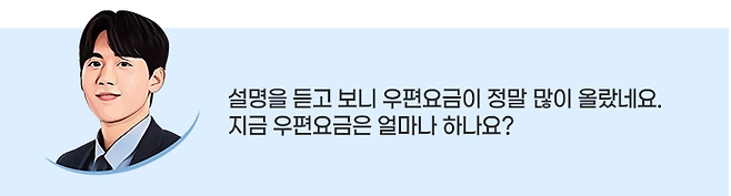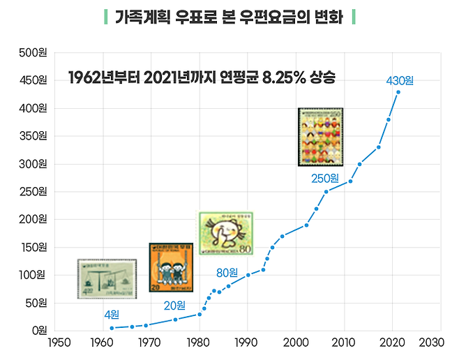 현재 보통우편요금(5~25g 규격 우편물)은 430원입니다. 1960년대부터 지금까지 우편요금이 연평균 8% 넘게 상승한 셈입니다.