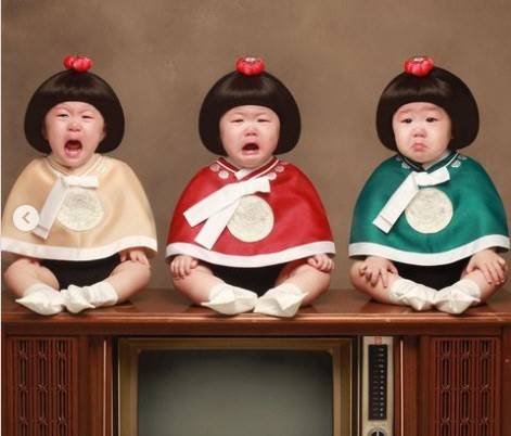 황신영은 21일 인스타그램에 "삼둥이 못난이컨셉 돌사진 먼저 나왔베베"라는 글과 함께 사진을 올렸다.