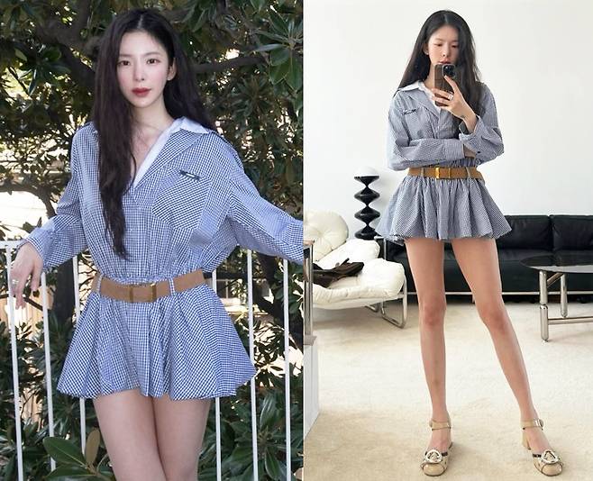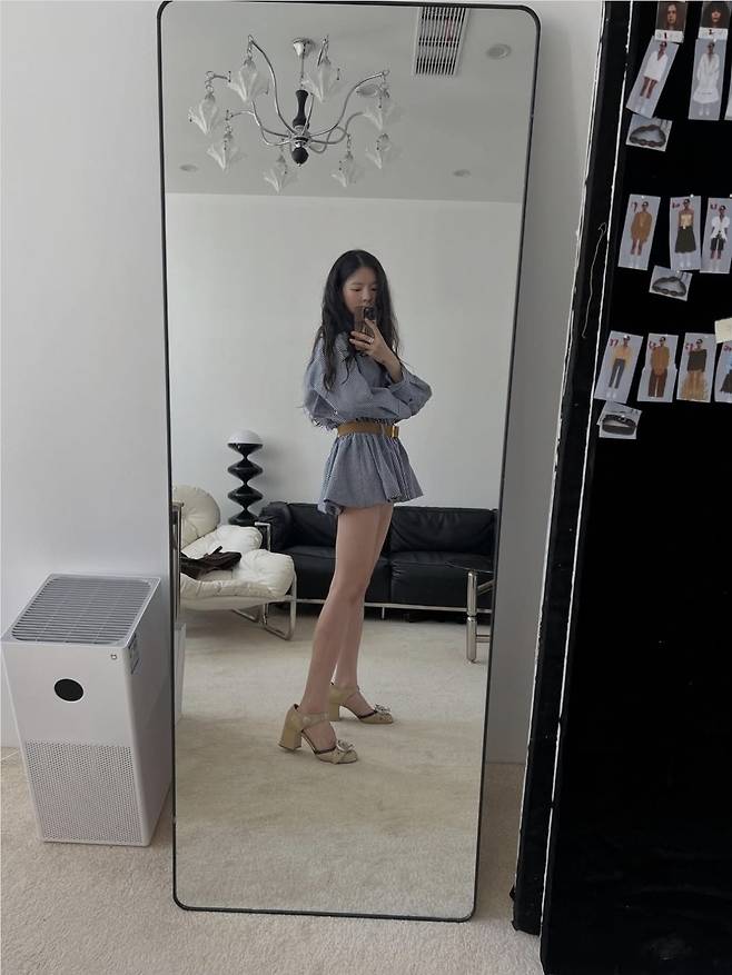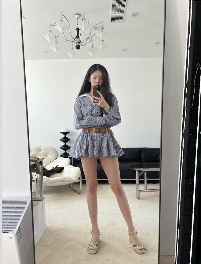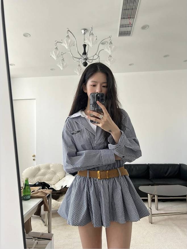 클래식한 블루 깅엄 체크 셔츠 원피스를 착용해 독특한 패션 감각을 드러냈습니다.