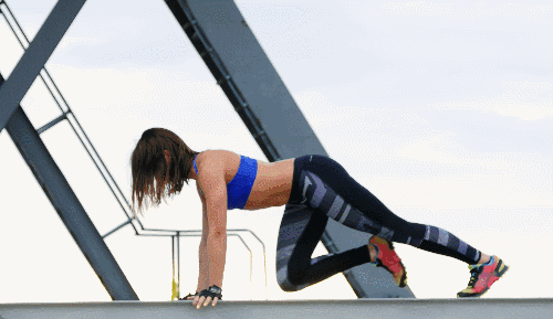 매트에 플랭크 기본자세로 엎드린 뒤, 오른쪽 다리를 공중으로 들어 올리고 무릎을 90도로 구부립니다. 다리를 당겼다가 다시 뻗는 동작을 반복합니다. 이후 왼쪽 다리도 같은 방식으로 들어 올려 동일하게 운동합니다.