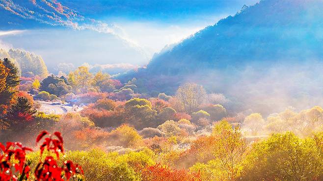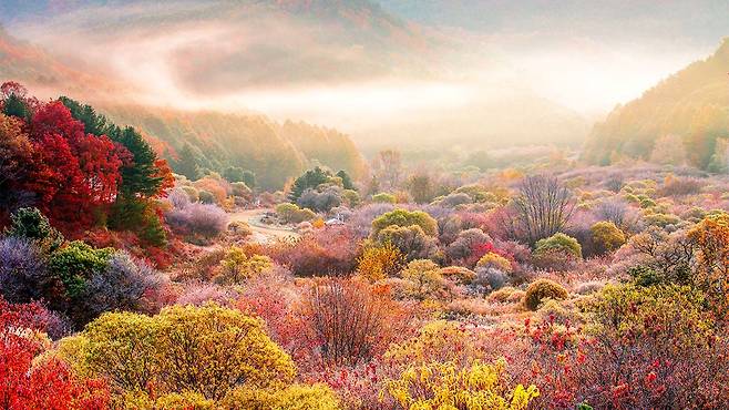 특히 동쪽 능선 너머에서 해가 떠오를 무렵, 햇살이 서리와 안개에 반사되어 도로 전체가 황금빛으로 물드는 순간은 마치 꿈처럼 느껴진다.