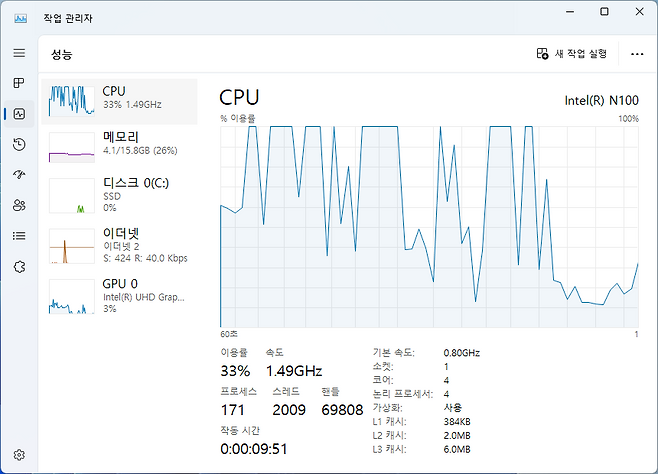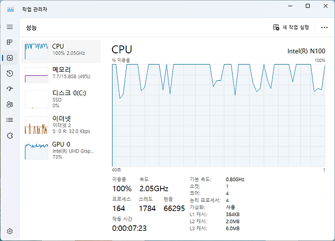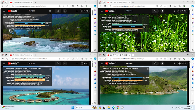 윈도우를 초기화하고 어느 정도의 성능인지 봤습니다. 당연히 게임은 기대하지 않았고, 게임을 위한 PC도 아니기 때문에 게임 테스트는 하지 않았습니다. 워드나 엑셀 등의 업무용 프로그램은 시원스럽게 돌아가고 4K 해상도의 유튜브 영상 4개를 동시에 재생해도 각 영상이 끊기지 않고 재생되는 놀라운 성능을 보여줍니다. 어지간한 데스크탑이나 노트북 PC에서도 기대할 수 없는 능력이죠. 사용하면서 대단하다고 느껴집니다.